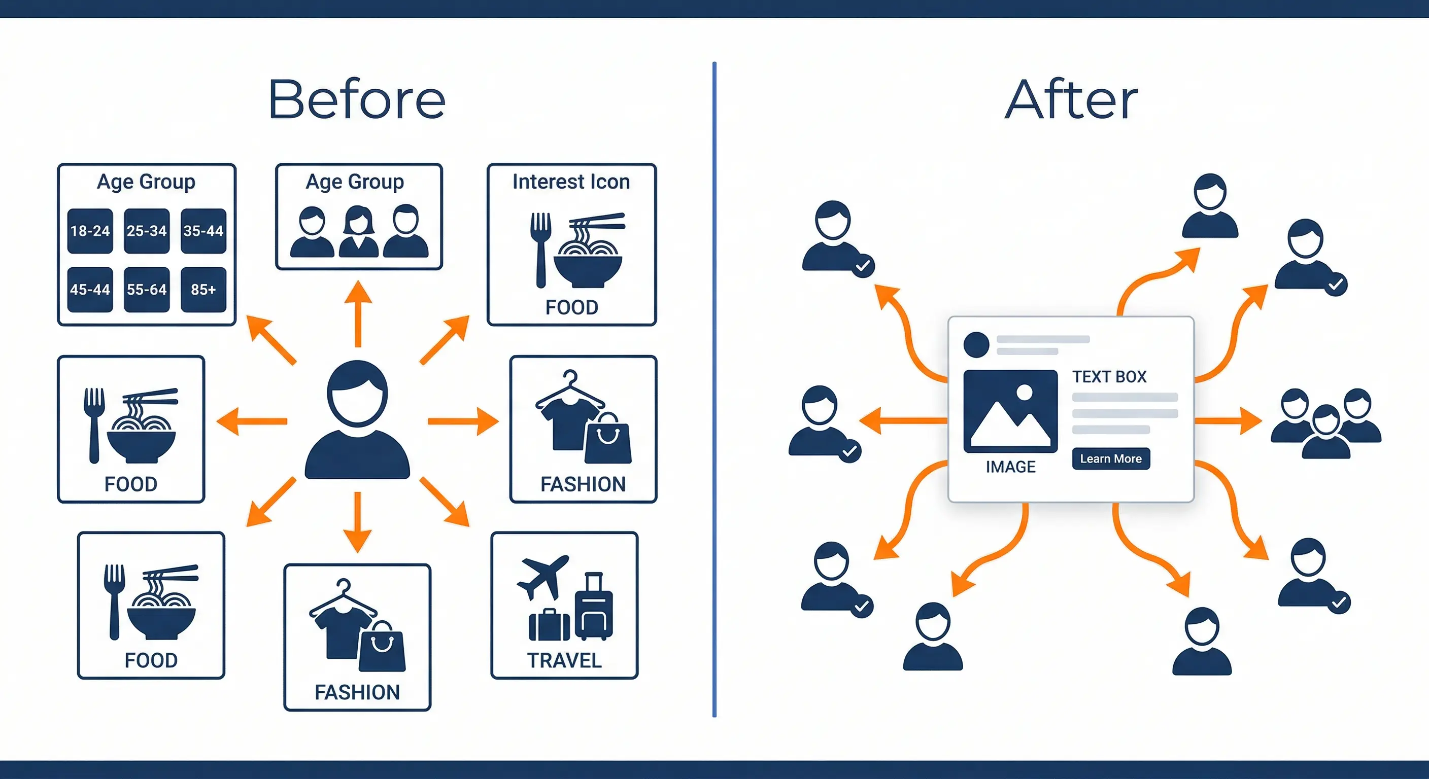 ส่วนที่หลายคนสังเกตได้ชัดคือ Interest Targeting แบบเดิม เช่น เลือกแค่คนที่ชอบ "ร้านอาหาร" หรือ "เสื้อผ้าแฟชั่น" เริ่มได้ผลน้อยลงเรื่อยๆ Andromeda อ่านสัญญาณจาก Creative แล้วหาคนที่มีแนวโน้มจะตอบสนองได้แม่นกว่าที่คุณตั้งเอง