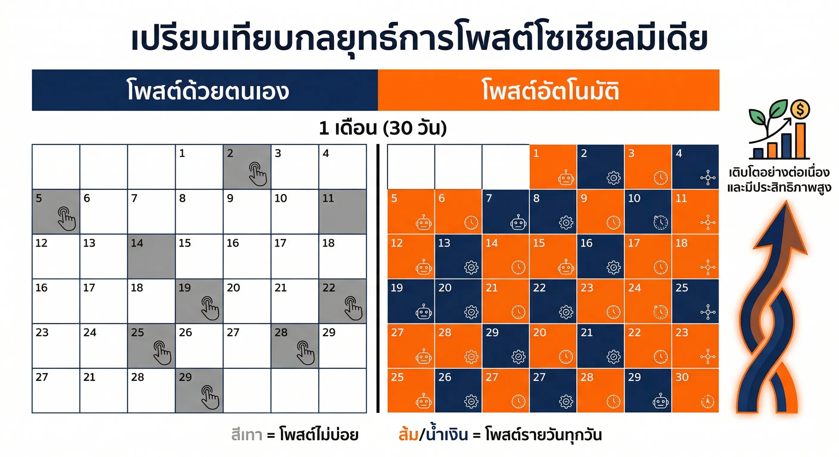 เพจที่ใช้ระบบอัตโนมัติโพสต์สม่ำเสมอ 30 วัน/เดือน เทียบกับเพจที่ดูแลเองซึ่งโพสต์เฉลี่ย 4–8 ครั้ง/เดือน