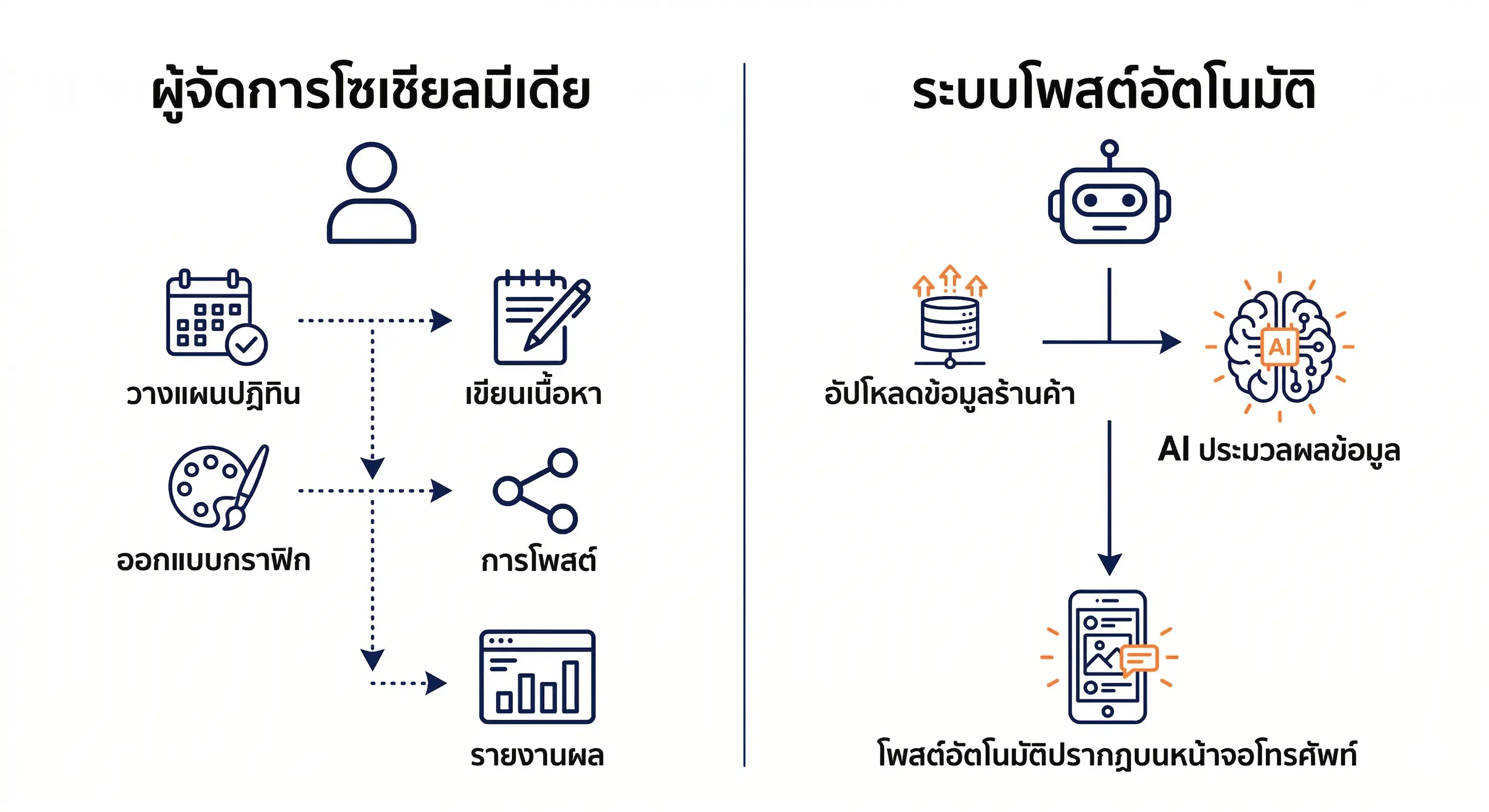กระบวนการดูแลเพจแบบจ้างคน (ซ้าย) เทียบกับระบบอัตโนมัติ (ขวา) — ผลลัพธ์คล้ายกัน แต่กระบวนการและต้นทุนต่างกันมาก